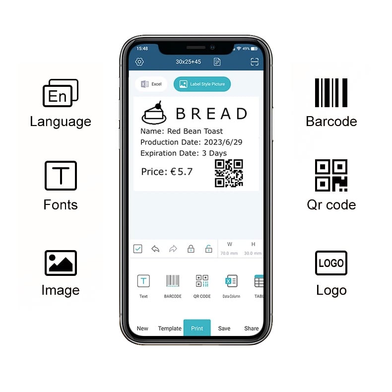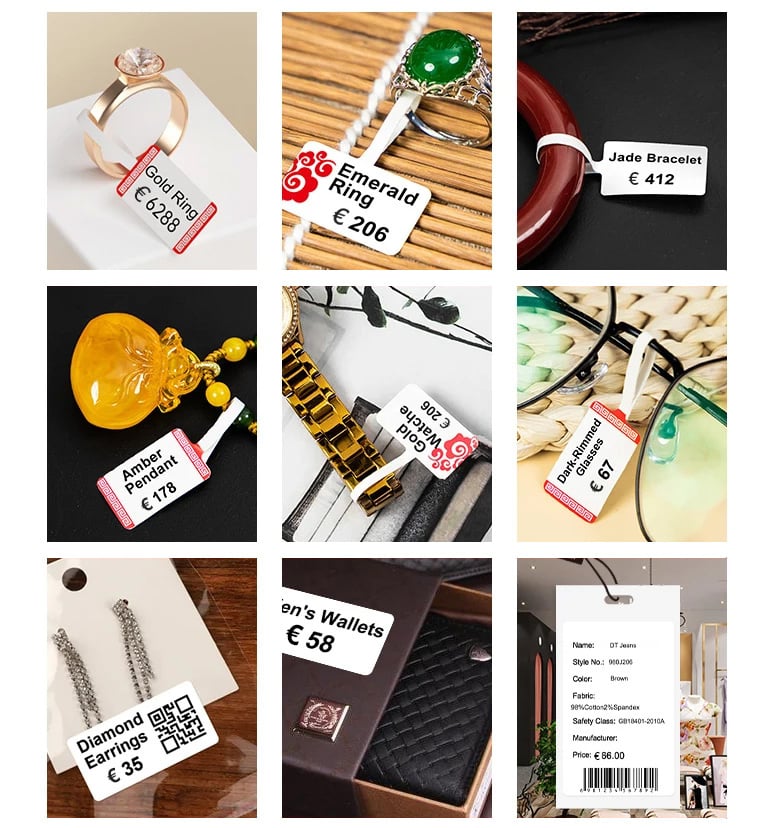 - L APP gratuita offre numerosi modelli, con cui puoi stampare facilmente qualsiasi etichetta di cui hai bisogno: etichette per abbigliamento, etichette per prezzi, etichette per cavi, etichette per gioielli, etichette per indirizzi, etichette per cartelle, etichette per alimenti, etichette con nome e così via; testo modificabile, codice a barre, logo, immagine, tabella, ora, linea, ecc