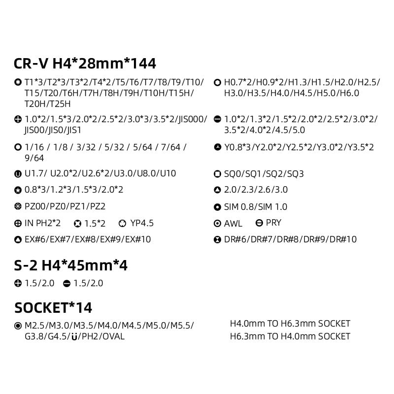 - 144 punte al cromo vanadio (Cr-V), molto resistenti, utilizzabili con trapano o avvitatore elettrico