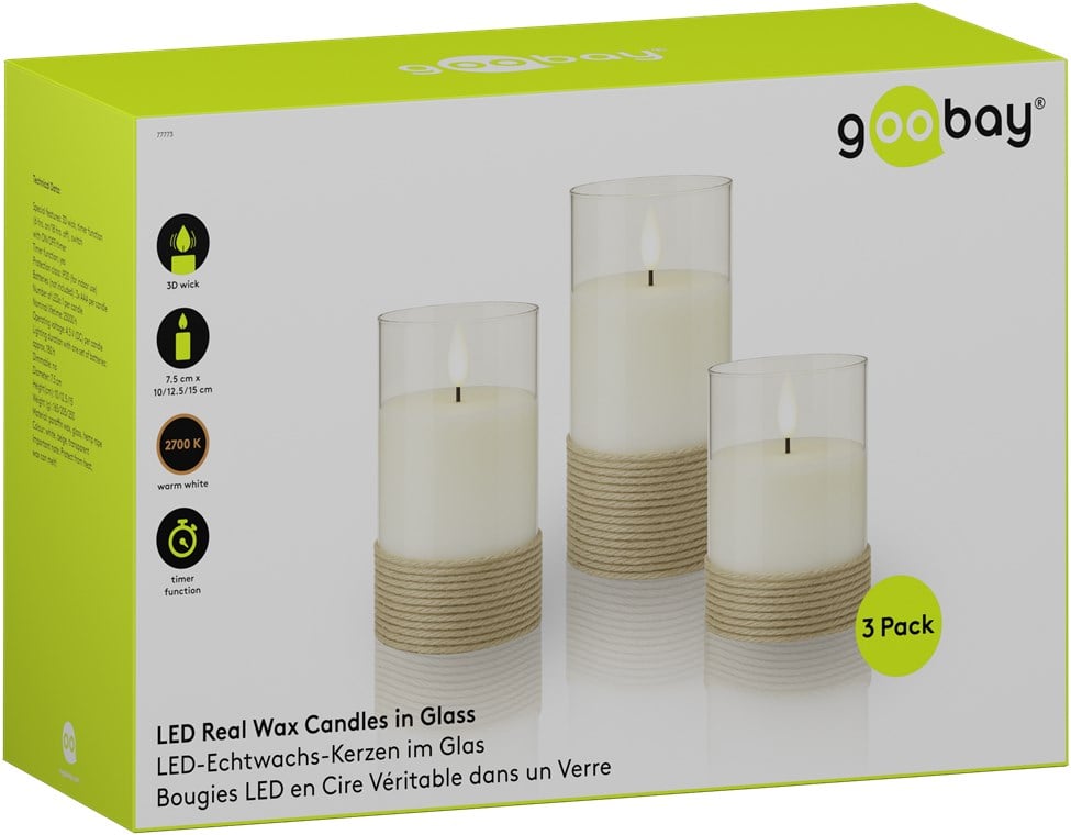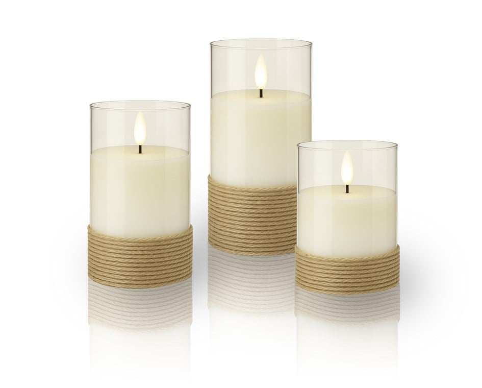 - Eleganti candele a colonna in tre diverse dimensioni per una calda luce di candela con una fiamma naturale e tremolante in un vetro trasparente, avvolto in canapa – completamente elettrica e sicura