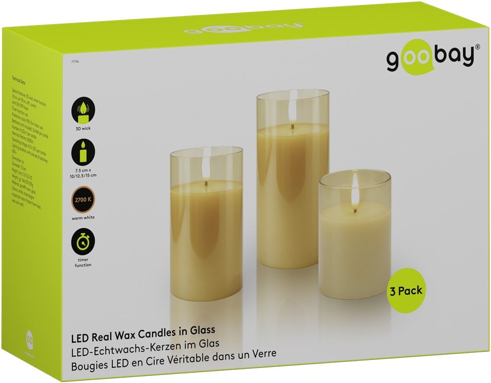 - Dimensioni (A x ø): 10 x 7,5 cm, 12,5 x 7,5 cm, 15 x 7,5 cm, ogni candela a LED è alimentata da 3x batterie AAA (non incluse)